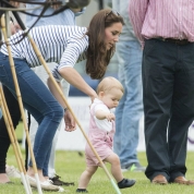 Prinţul George a fost fotografiat mergând, cu ajutorul mamei sale, ducesa de Cambridge. Primii paşi făcuţi de moştenitorul tronului britanic într-un spaţiu public au fost surprinşi duminică, 15 iunie 2014, la un meci de polo în scop caritabil, în care prinţii William şi Harry au jucat în echipe adverse.